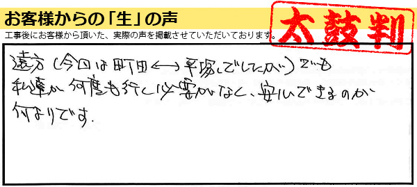 遠方(今回は町田⇔平塚でしたが)でも私達が何度も行く必要がなく、安心できるのが何よりです。